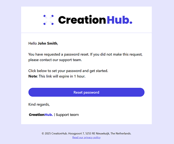 The reset link is valid for 1 hour. If it expires, simply request a new one.